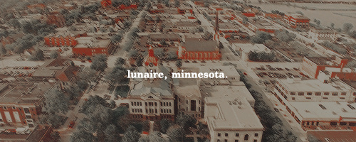 The college town setting for the verse BESTIAL, situated deep in the woods of Northern Minnesota, a few short miles away from the Canadian border. Surrounded by lakes and bisected by the Rainy River, the town is mostly based around Lunaire University, both named after the influential Lunaire family that founded the town and the college. In its CANON VERSE, Lunaire is a major hub for the supernatural community, due to the founding family being a legacy of werewolves. Though most of the community consists of werewolves, witches, vampires, banshees, hunters, and ghosts, a small part is still human—some aware and some unaware of the monsters that live among them. In its SECONDARY, NORMAL VERSE, much is the same except the supernatural does not exist.
